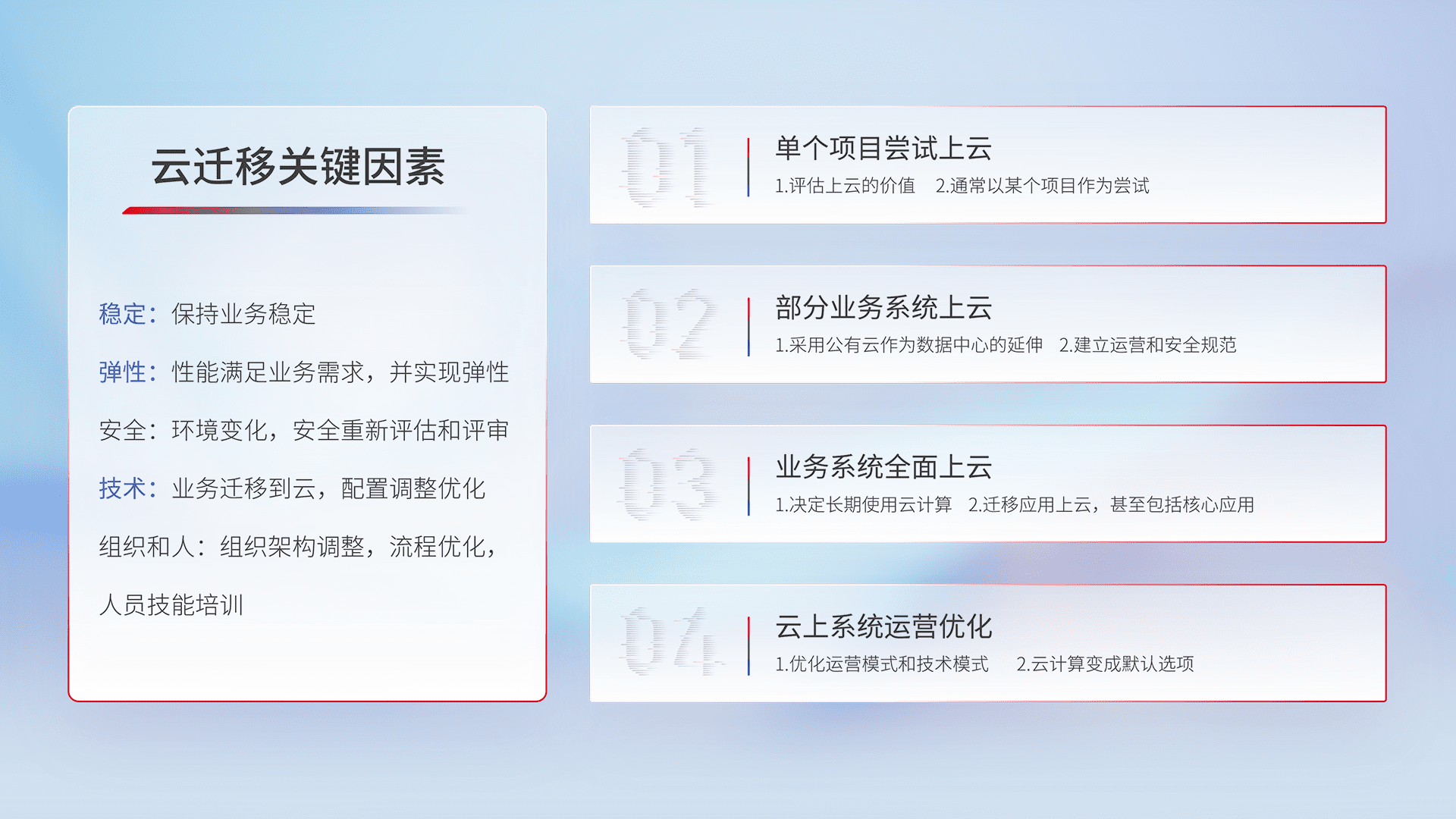 结合实际业务,,,从规划设计、、云平台选型、、、云原生改造、、、、数据迁移、、集成交付,,,迁移全过程为客户识别最佳上云路径,,,做好风险识别管理,,,,设计网络架构、、、身份权限、、、安全审计合规、、操作审计、、日志审计、、、监控告警策略、、、、多站点容灾设计等,,,对云上基础设施进行整体规划,,,,提升IT治理水平,,,,以满足弹性、、、高可用、、、、高性能的需求。。。。